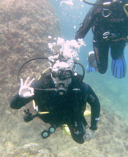 06/12/10. En Tossa de Mar, de nuevo con traje seco (y plomos en los bolsillos del Jacquet). Estreno aletas y gafas. ¡Bien, van muy bien! 19,5 m y 39'.